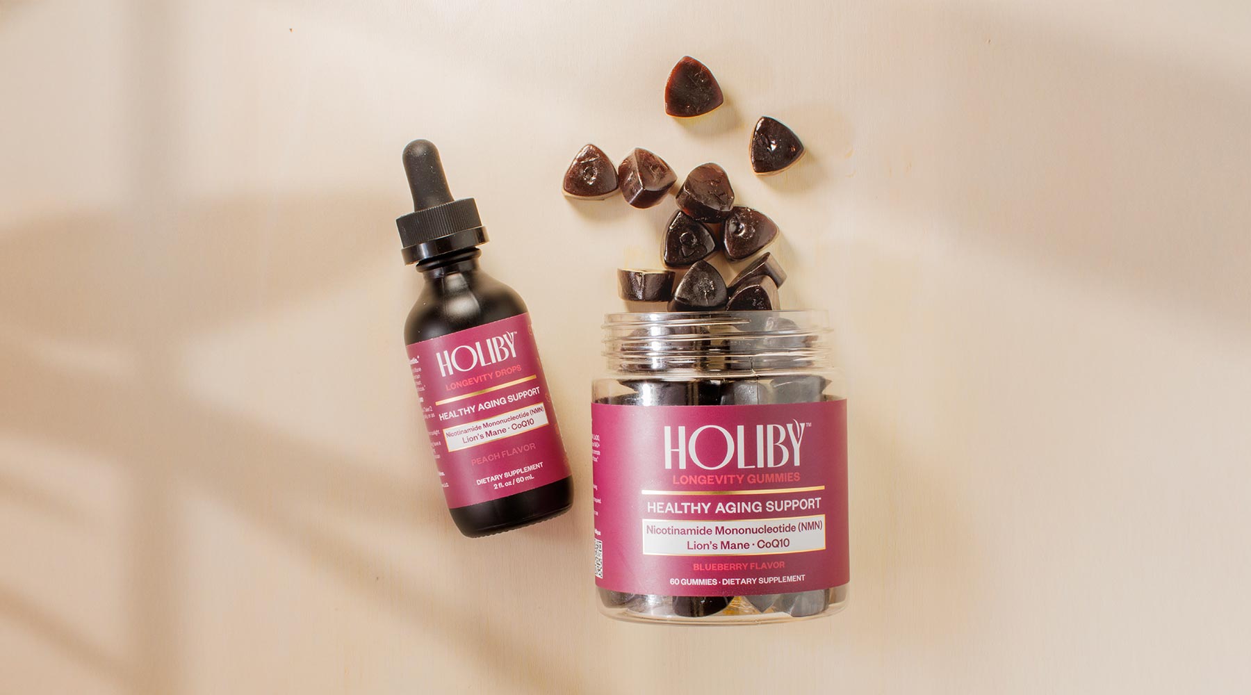 Holiby™ Longevity Gummies are formulated with NMN (Nicotinamide Mononucleotide), CoQ10, and Lion’s Mane mushroom to help support cognitive clarity, mitochondrial function, and long-term well-being.